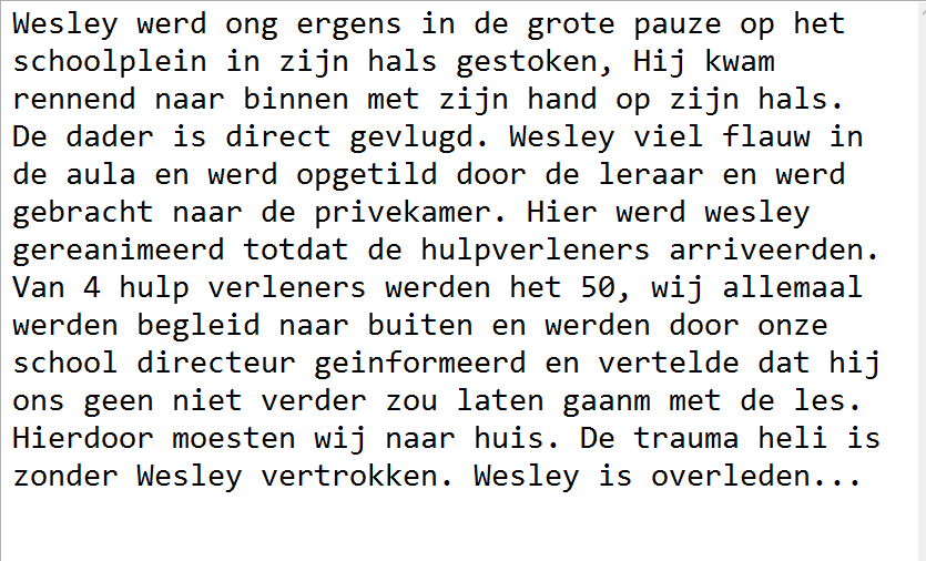 Ik denk, (uit verhalen van anderen) dat de woordenwisseling in de les, door is gegaan naar het schoolplein, ik was op dat moment fiets aan het pakken (weekend..) toen ik opeens Wesley de school in zag rennen.. voordeur zat onder de bloed-spetters.quote:Op vrijdag 10 oktober 2014 17:16 schreef Yasmin23 het volgende: