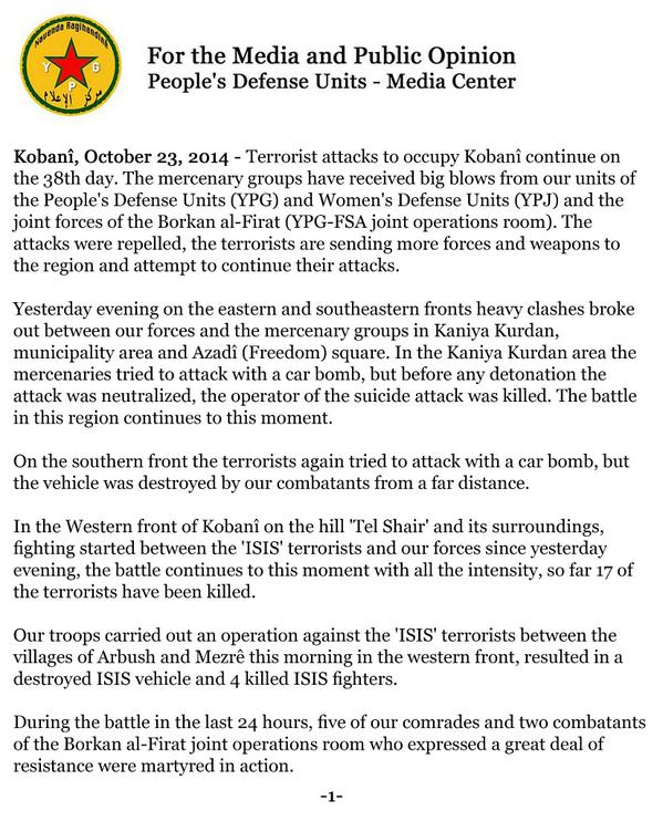 twitter:DefenseUnits twitterde op woensdag 22-10-2014 om 21:08:26#YPG Media Release #Kobane 10/22/2014 @DefenseUnitsYPJ @Rojekazad @polatcano #ISIS #ISIL http://t.co/NDkhZzTpj1 reageer retweet