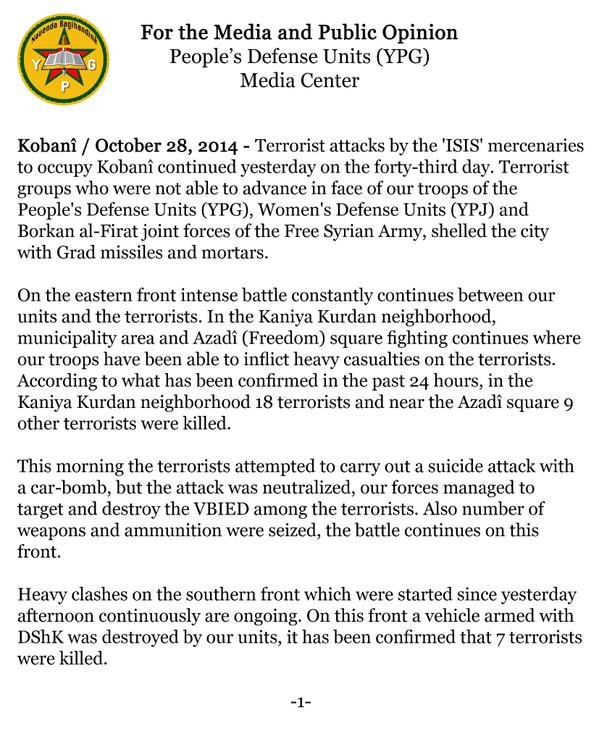 twitter:DefenseUnits twitterde op maandag 27-10-2014 om 18:57:02#YPG Press Release #Kobane 10/27/2014 @DefenseUnitsYPJ @Rojekazad @polatcano #YPJ #Kobani #ISIS #ISIL http://t.co/NPdXspzmHb reageer retweet