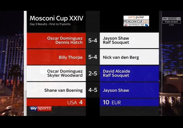 SVB met typische SVB pech van een bijna 4-1 voorsprong naar een 5-3 nederlaag. Europa op 7-5 voorsprong.