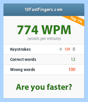 Nee, ik typ normaal een stuk trager, is erg vermoeiend om op zo'n tempo te typen.quote:Op donderdag 8 januari 2015 17:22 schreef Landysh het volgende: