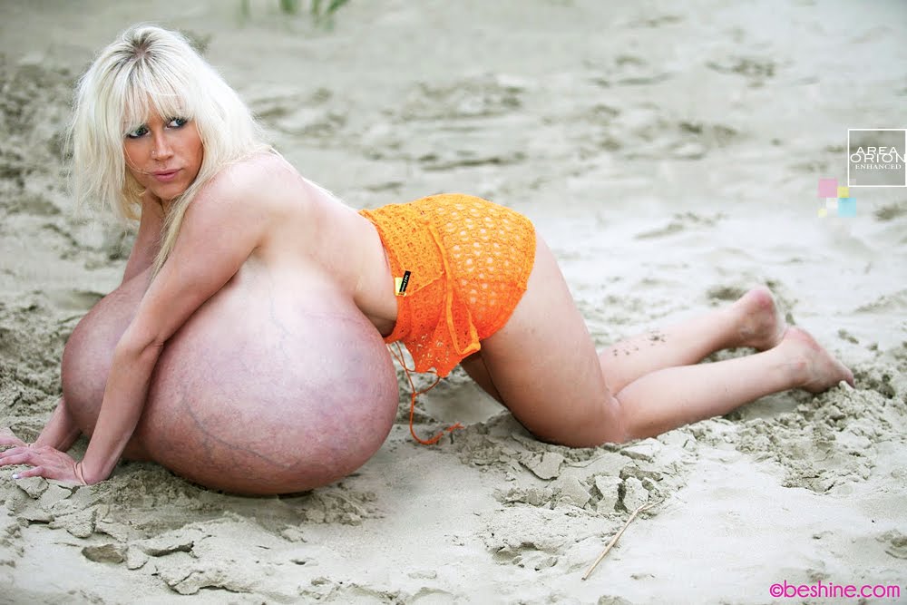 Hoe kan zij in hemelsnaam rechtop staan als haar zwaartepunt door die berg siliconen zowat buiten haar lichaam lijkt te vallen? Zou wel een leuk opdrachtje zijn voor eerstejaars staticastudenten bedenk ik me. Gegarandeerd volle collegezalen.quote: