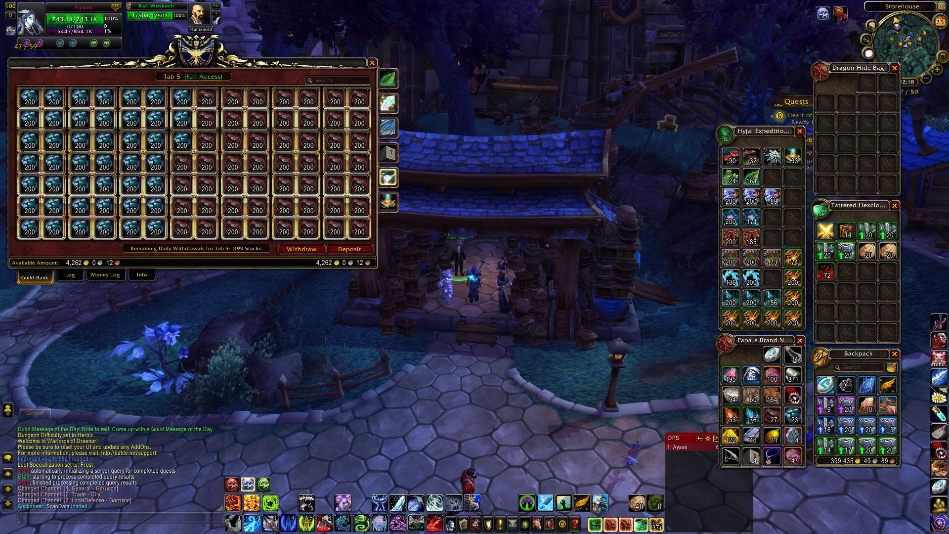 Gold is natuurlijk voor iedereen anders. Ik heb laatst weer een trinket gekocht voor 21k. En koop ook af en toe crafted gear. Als ik even snel kijk naar de wowarmory van Ayase dan zie ik helemaal geen gekochte gear of crafted gear. Dus dan kom je ook sneller aan de 400k gold Maar het is zeker een mooie voorraad mats!. Dat kan ik niet ontkennen | |