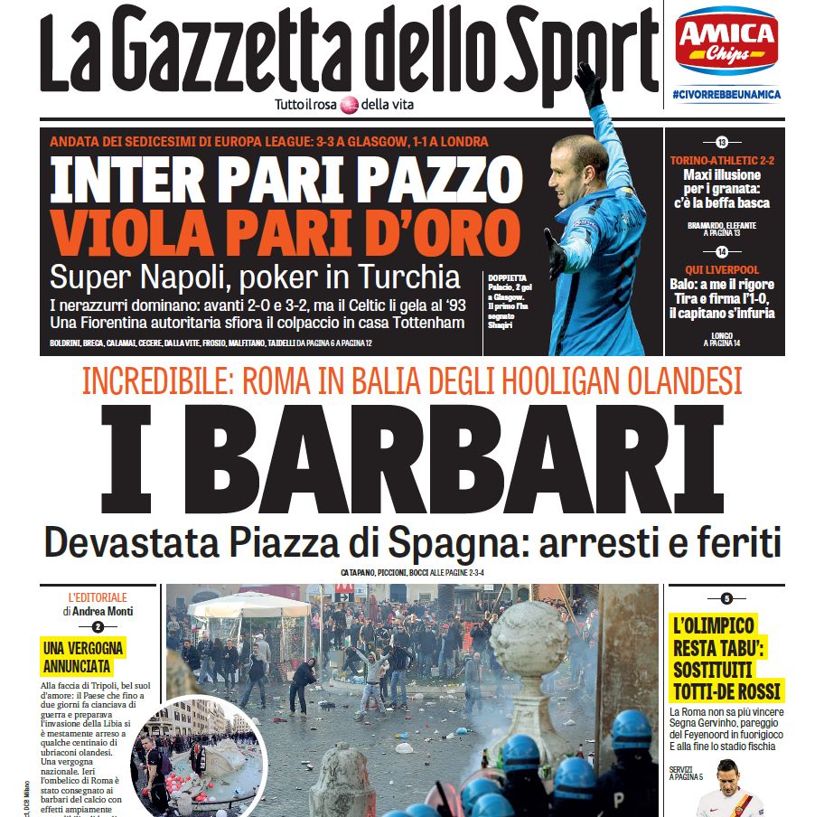 Niet overal is de wet hetzelfde. Zeker in een land als Italië waar hooliganisme een groot probleem is zijn ze daar blijkbaar gewoon veel strenger op. Als die straffen gegeven zijn zullen ze gegeven mogen worden en dus zijn ze wat mij betreft ook terecht.quote:Op donderdag 19 februari 2015 23:34 schreef Insomnia_ het volgende: