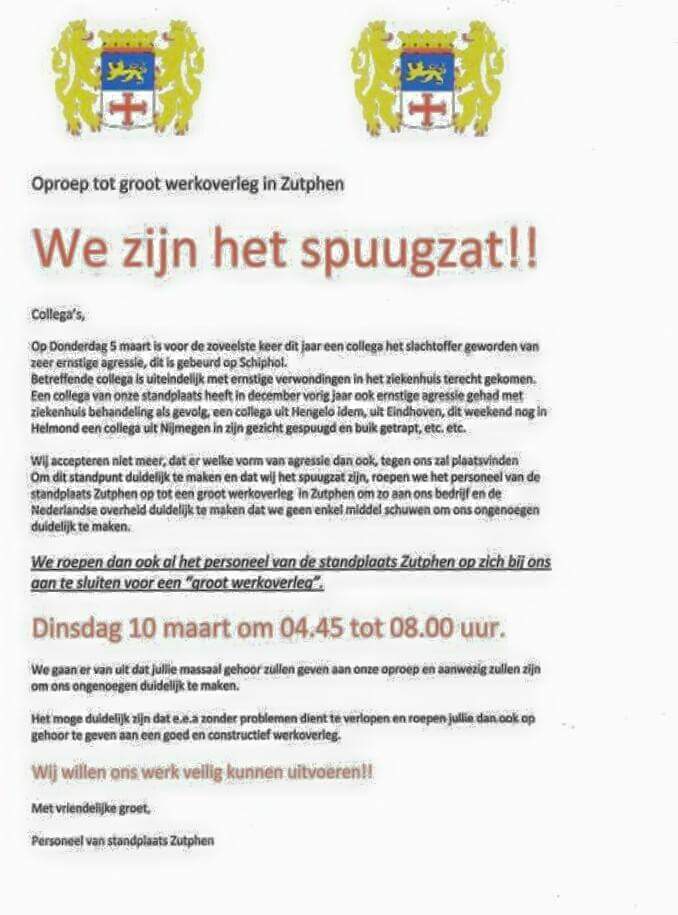 Dinsdagochtend legt standplaats Zutphen grotendeels het werk neer voor een werkoverleg. Gaat al uitgebreid rond op Twitter.