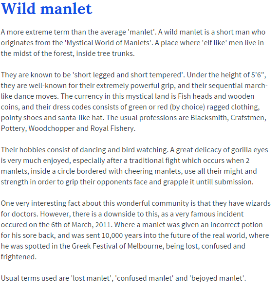 quote:Their hobbies consist of dancing and bird watching. A great delicacy of gorilla eyes is very much enjoyed, especially after a traditional fight which occurs when 2 manlets, inside a circle bordered with cheering manlets, use all their might and strength in order to grip their opponents face and grapple it untill submission.