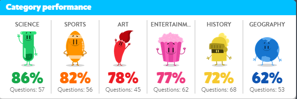 m'n percentages per categorie zijn wel mooi trouwens. Art 87, science 84, history en geography 78, entertainment 74 en sports 69