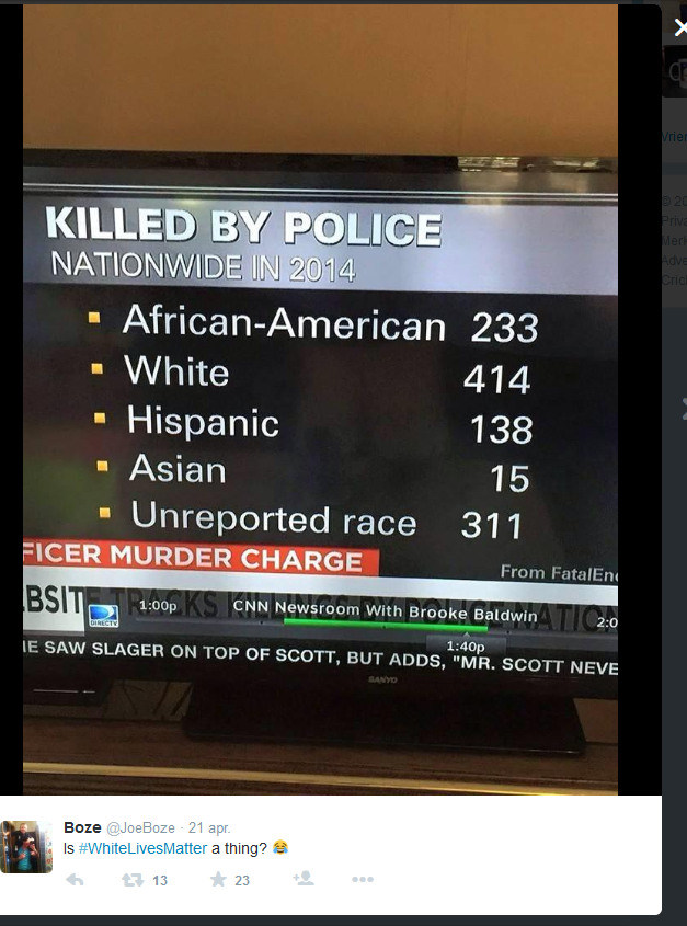 't is tenminste nog een reden. Kun je van blanke mensen niet zeggen, want die rellen om belangrijke zaken zoals sport en... pompoenen.quote:Op dinsdag 28 april 2015 19:56 schreef Lucifer_Doosje het volgende: