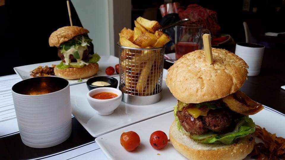 -Levelburger: huisgemaakte hamburger van rund op Marokkaans brood met cheddar, gekonfijte rode ui, bacon, tomaat, little gem, tartaarsaus & huisgemaakte frites