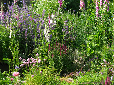 Om te beginnen heb ik alle paarse campanula's weggehaald (op een paar na), die kleur vloekte zo met m'n vingerhoedjes. Ik heb alle klaprozen weggehaald (allemaal bleekrood van kleur, ik had witte en roze gezaaid!) en wel een kuub onkruid. Ik heb een van de nieuwe stamrozen geplant ("The Pilgrim"), nu nog een stamroos planten en voor vier struikrozen een plek verzinnen.