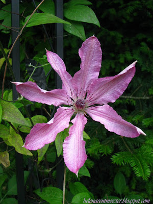 De clematis Hagley Hybrid heeft mooie grote bloemen - vorig jaar in de verdrukking door een gigantische hedera, die heb ik een paar weken geleden verwijderd en vervangen door nog een clematis en een winterjasmijn![]()