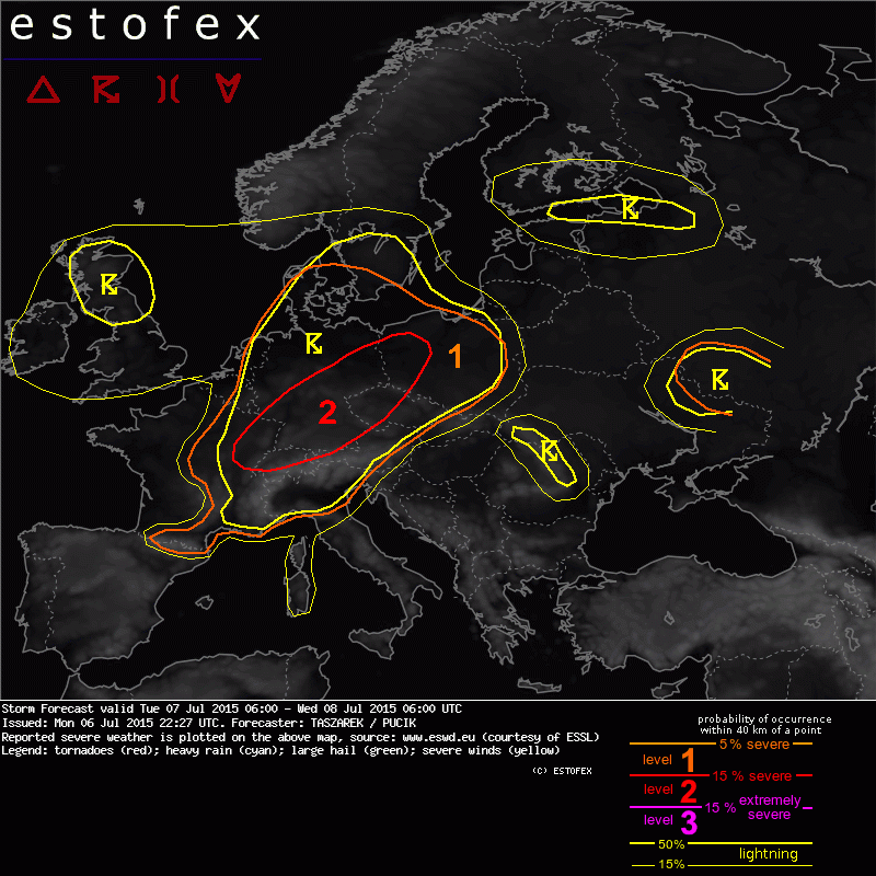 A level 2 was issued for parts of Germany, Switzerland and France, W Czech Republic, W Poland mainly for the damaging wind gusts, large and very large hail, excessive precipitation and in the lesser extent for the tornadoes.