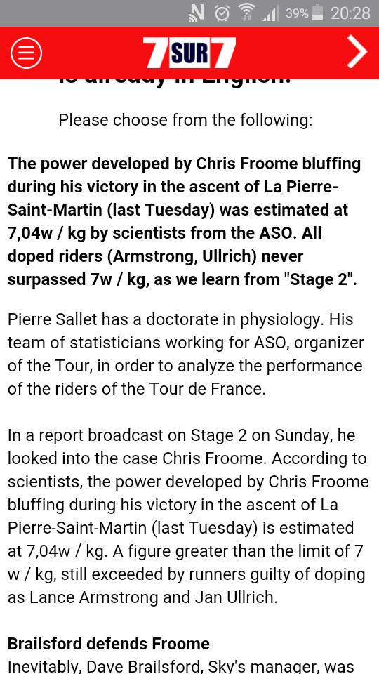 De wattages die Chris Froome tijdens zijn overwinning op La Pierre-Saint-Martin vorige week dinsdag trapte zijn volgens een expert van Tourorganisatie ASO "abnormaal hoog". De geletruidrager ontwikkelde op de slotklim een vermogen van 7,04 Watt per kilogram lichaamsgewicht, becijferde de Franse wetenschapper Pierre Sallet. Ook Lance Armstrong en Jan Ullrich gingen ooit door de grens van 7 Watt per kilo, maar iedereen weet hoe zij dat voor mekaar kregen. "Dit zijn schattingen", verdedigde Sky-baas David Brailsford zich sereen.