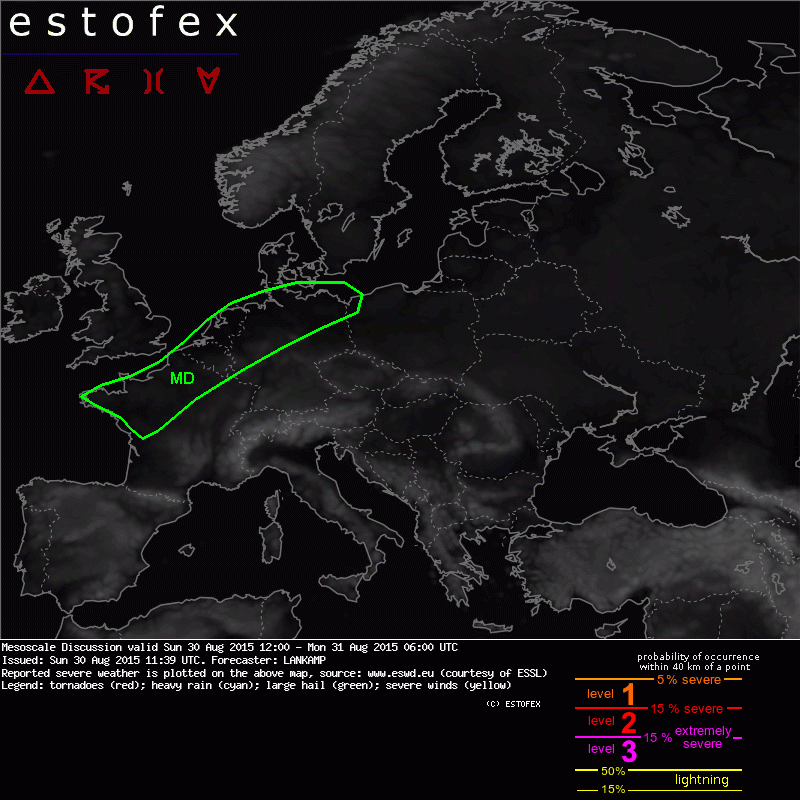 A level 1 was issued for N-France, Belgium, the Netherlands, N-Germany and the SW Baltic Sea (including surrounding areas) mainly for severe wind gusts, large hail and an isolated tornado threat.