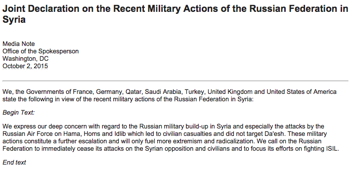 Maar niets van dat alles. Rusland (lees: Poetin) is Het Grote Gevaar volgens de westerse propaganda en het westen moet de 'gematigde' (HAHAHA) rebellen steunen tegen IS.