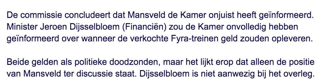 Dat is dus niet zo. Volgens het rapport heeft ze de kamer onjuist geinformeerd. En dan ga je gewoon nat.quote:Op woensdag 28 oktober 2015 18:34 schreef icloud het volgende: