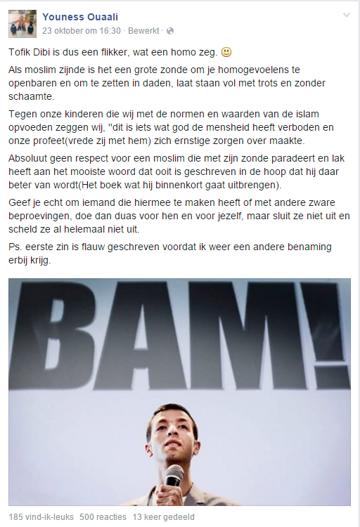 Zover kan die Salah dus helemaal niet doordenken. Door mensen die andere het leven niet gunnen is Rachid zijn leven niet veilig.... Niet omdat Rachid toevallig homo is. Zou gewoon fijn zijn als dit soort mensen zelf zouden gaan nadenken ipv de opdrachten te volgen van iets niets bestaans.. | |