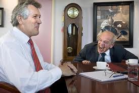 Dirk Demagoog en Jörgen Raymann in een televisieshot.