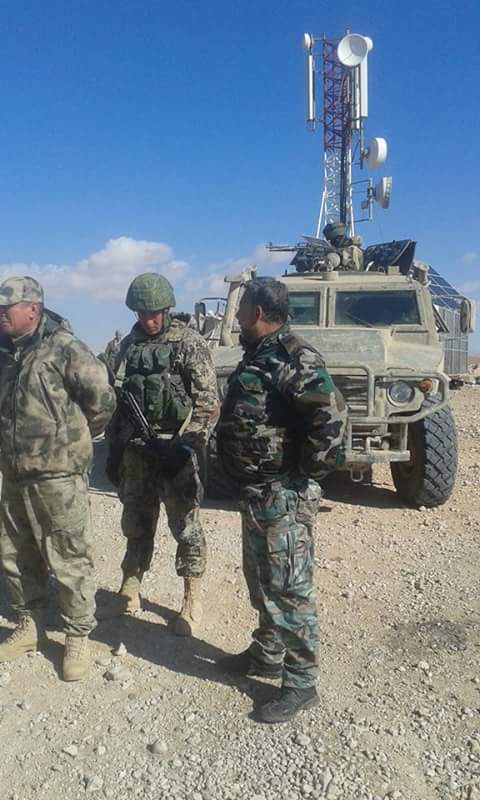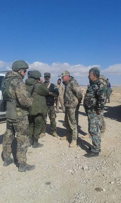 Syrische en Russische officieren en soldaten nabij IS-gecontroleerde Palmyra: