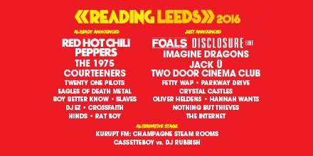 De grote Britse festivals worden voor mij steeds minder interessanter. Alleen Glasto vind ik nog de moeite. Een paar jaar terug had ik nog graag eens naar Reading/Leeds willen gaan, maar die hebben ook al een aantal jaar een slecht affiche.quote:Op maandag 22 februari 2016 10:33 schreef DavetheNL het volgende: