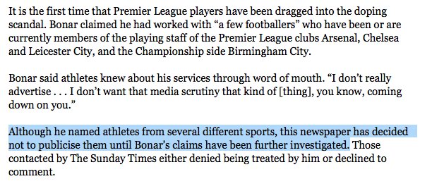 Voorpagina van The Times:![]() Het gaat dus om één of andere dokter die zegt dat hij 150 sporters heeft helpen dopen, waaronder Premier League-spelers, cricketers, tennissers en 'British TDF cyclists'. | |