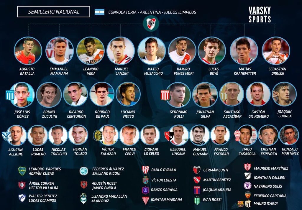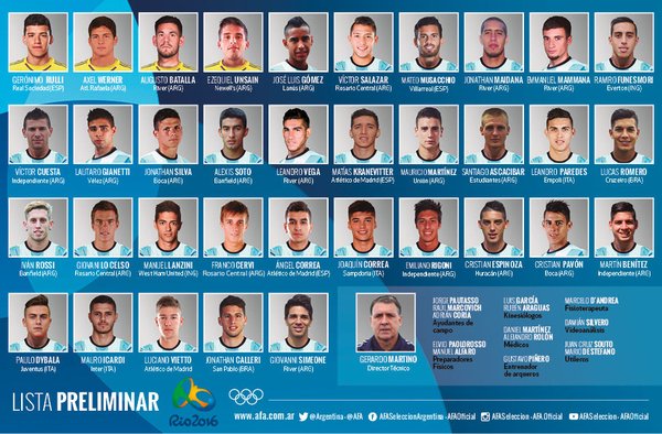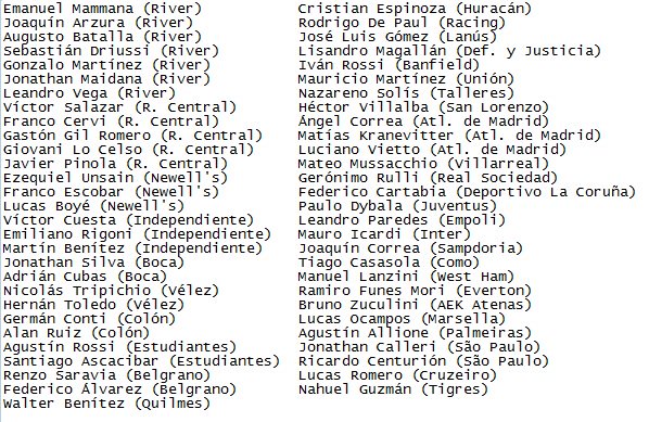 Gerónimo Rulli (Real Sociedad); Emanuel Mammana (River Plate), Mateo Musacchio (Villarreal), Rogelio Funes Mori (Everton), Jonathan Silva (Boca Juniors); Matias Kranevitter (Atletico Madrid), Giovani Lo Celso (Rosario Central), Leandro Paredes (Empoli); Cristian Espinoza (Huracan), Paulo Dybala (Juventus), Angel Correa (Atletico Madrid)