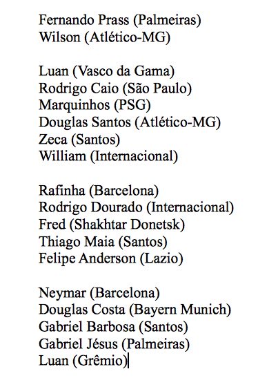 Neymar (FC Barcelona)*, Gabriel Barbosa (Santos), Gabriel Jesus (Palmeiras), Malcom (FC Bordeaux), Luan (Gremio)