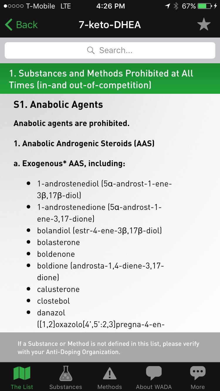 Je zit in een professioneel team, dan is er toch wel iemand die dat kan onderzoeken? Keto-7 bevat DHEA. Google daar maar eens op. Daarnaast is er een WADA app, dat levert dit op als je zoekt op DHEA: ![]()