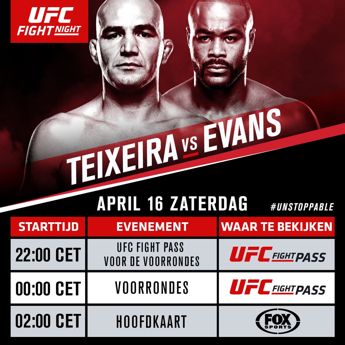 Zaterdag 1:30 uur UFC on Fox: Teixeira vs Evans (also known as UFC on Fox 19) is an upcoming mixed martial arts event that will be held on April 16, 2016 at Amalie Arena in Tampa, Florida. De return van Nurmagomedov (2 jaar eruit) en Swanson (1 jaar eruit) en ook van TUF 14 Winnaar John Dodson die weer terug is op 135lbs. Daarnaast ook TUF Winnaars Evans, McGee, Chiesa en Ferreira en TUF Verliezers Namajunas en Gamburyan in actie dus dat wordt een grote top show! Main Card (2:00) Light Heavyweight - Teixeira #4 vs #7 Evans Strawweight - Namajunas #3 vs #4 Torres Lightweight - Nurmagomedov #2 vs Horcher Featherweight - Swanson #6 vs #10 Dias Prelims (0:00) Lightweight - Dariush #7 vs #14 Chiesa Women's Bantamweight - Correia #8 vs #12 Pennington Welterweight - McGee vs Ponzinibbio Lightweight - Dober vs Makhachev Fight Pass Main Card (22:00) Bantamweight - Dodson vs Gamburyan Welterweight - Brown vs Graves Middleweight - Bamgbose vs Ferreira Welterweight - Zaleski dos Santos vs Akhmedov http://www.ufc.com/event/ufc-fight-night-tampa https://en.wikipedia.org/(...)gomedov_vs._Ferguson | |