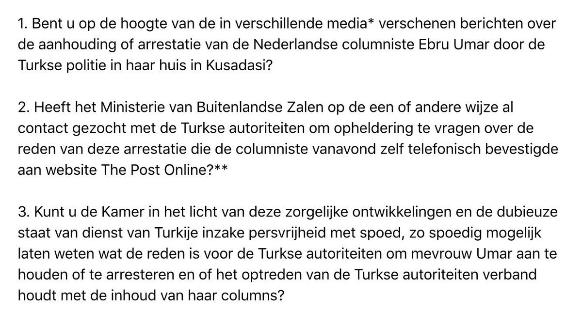http://www.nu.nl/algemeen(...)itie-meegenomen.htmlquote:Ebru Umar, een kritische Nederlandse columniste van Turkse afkomst, is in Turkije door de politie uit haar huis in Kusadasi gehaald. Umar heeft dat zaterdagavond telefonisch bevestigd aan The Post Online.