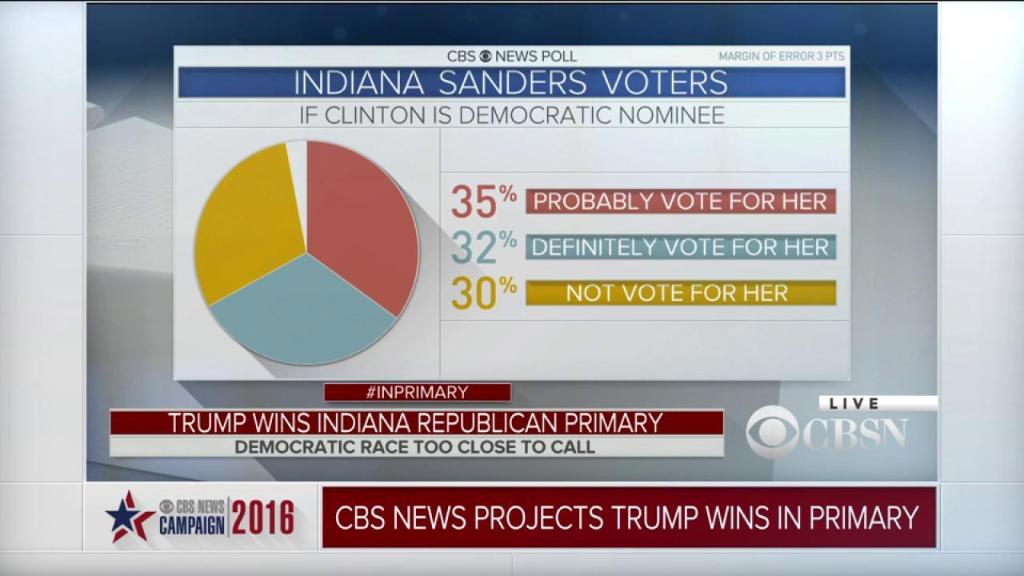 Z'n laatste kans / verbitterd.quote:Ik snap alleen niet waarom Sanders nog steeds mee doet. hij heeft dan wel Indiana gewonnen in percentages maar als ik hier kijk dan zie ik dat Clinton toch 1 delegate uitloopt.