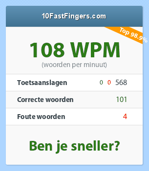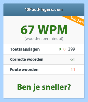 Had ook wel toetsaanslagen willen doen, maar dat leek me sowieso niet helemaal eerlijk aangezien je dan willekeurig op je toetsenbord kan rammen (gezien foutieve toetsaanslagen ook meetellen). Maar goed, dat is met wpm eigenlijk net zo.quote:Op maandag 24 oktober 2016 19:26 schreef TwenteFC het volgende:
