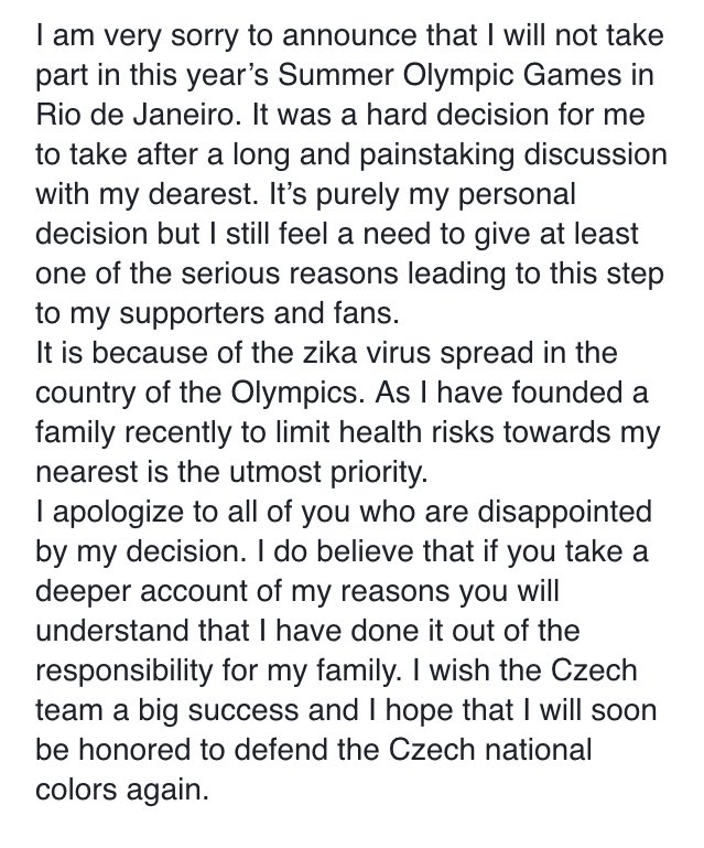 Geen Berdych, 'want zika'.