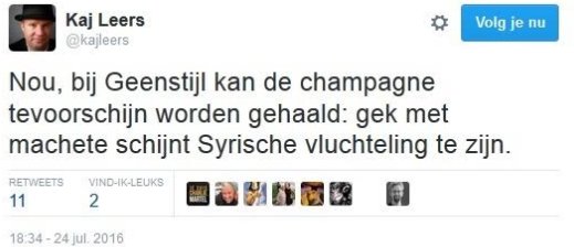 | Geen terrorisme. Wel een allochtoon die zichzelf niet in bedwang kan houden. Doet mij denken aan twee eerdere aanvallen in Duitsland deze week. | |