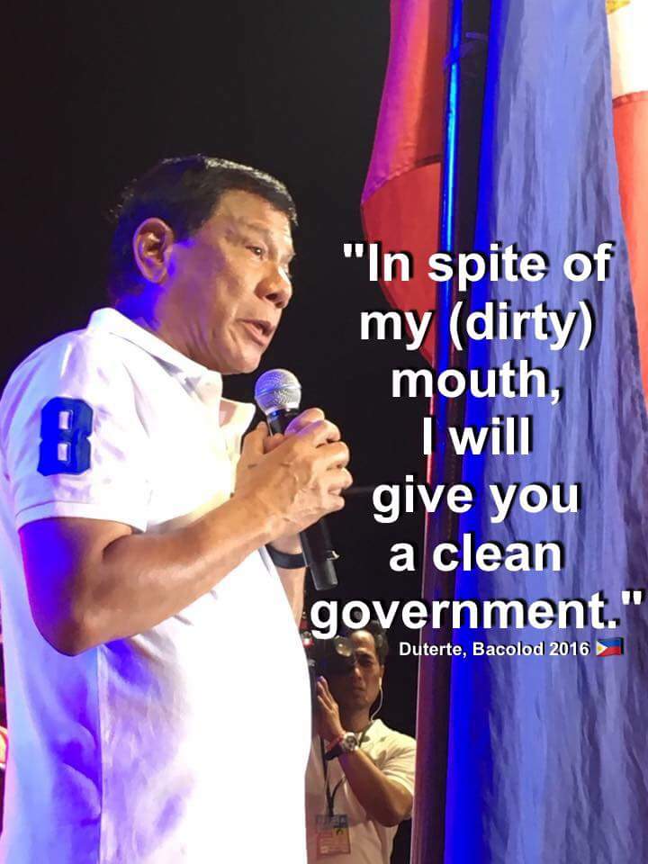 Duterte is pas twee maanden president van de Filipijnen en heeft al een wapenstilstand gesloten met de communistische rebellen. Oktober gaan de onderhandelingen met de rooien door. Hij heeft een handreiking gedaan aan de islamitische terreurbeweging Moro Islamic Liberation Front. Hij is van plan om eind 2017 een start te maken met de grootste infrastructurele project die de Filipijnen ooit hebben gezien. Hij pakt de islamitische terreurbeweging Abu Sayyaf harder dan hard aan nadat ze een week geleden nog eens een onschuldige man hebben onthoofd. Hij komt zijn belofte na om corruptie aan te pakken en heeft 2000 drugscriminelen laten doden en honderdduizenden laten opsluiten. Hij pakt de grote mijnbouwbedrijven aan door Regina Lopez aan te stellen als Minister van Mijnbouw. Die vernietigen de Filipijnse natuur voor alleen maar winst op de korte termijn. Inheemsen die stevig protesteren krijgen kogels en kijken het met lede ogen aan. Duterte is de eerste president die bezig is met wetten om de Filipijnse natuur te beschermen en daarnaast ook bezig met het op touw zetten van toezicht voor vernietigende Filipijnse industrie. Unicum, vorige presidenten schoof je tien miljoen dollar onder hun neus en ze lieten het allemaal doorgang vinden. Prima, dat is wat de Filipijnen nodig hebben.