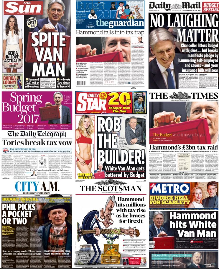 Philip Hammond’s budget disaster http://www.spectator.co.u(...)ds-ambition-deficit/ De kranten waren ook wel vrij eensgezind. ![]() | |