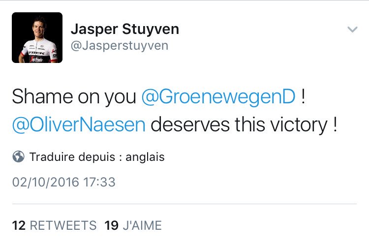twitter:Jasperstuyven twitterde op zondag 02-10-2016 om 17:33:33Shame on you @GroenewegenD ! @OliverNaesen deserves this victory ! reageer retweet