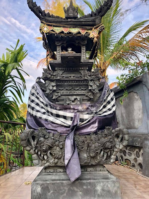 Als we 's avonds op de afgesproken tijd op de chauffeur staan te wachten is hij echter in geen velden of wegen te bekennen. We vertellen aan het personeel dat we naar de tempel zouden gaan. De chauffeur moest alleen onverwacht ergens heen, dus bieden een jongen en een meisje aan om met ons mee te gaan. Wayan en Ketut doen ons eerst een sarong om en mijn man nog een doek op het hoofd. Terwijl we naar de tempel lopen vertellen ze ons van alles over hun leven, de gebruiken, de taal etc. We voelen ons meteen bij hun op ons gemak.