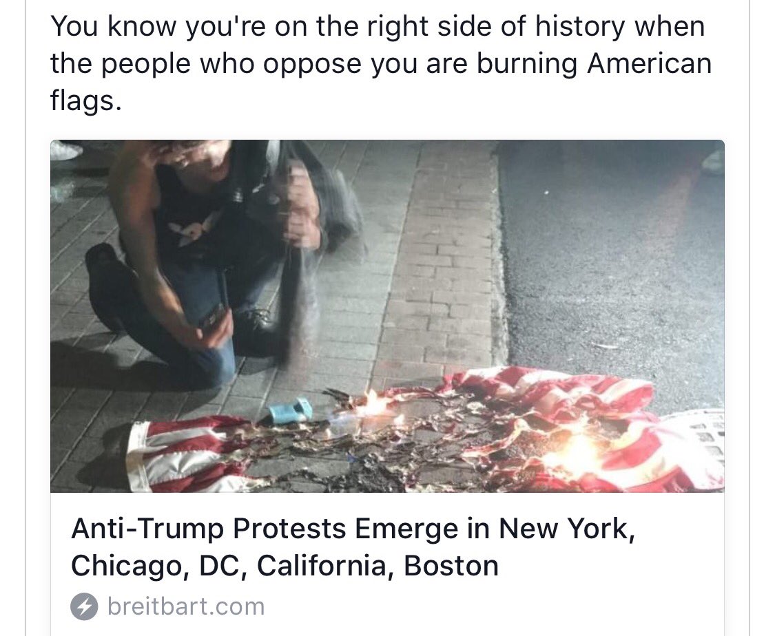 Je moet kijken naar wat er daadwerkelijk gebeurt. En dat is dat er al meerdere mensen in elkaar zijn geslagen omdat ze op Trump zouden hebben gestemd en protesten die door de politie inmiddels als 'opstand' worden geclassificeerd.