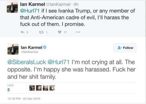 Moeten we Trump en zijn familie nu heel zielig vinden?quote:Wat niet in deze lijst voorkomt zijn de duizenden twitter reacties, doodbedreigingen, etc, vanuit diezelfde linkse hoek. Deze zijn in dit topic ook al vaak genoeg besproken. Meest recente voorbeeld was dat homokoppel welke Ivanka Trump lastig viel in het vliegtuig. Elk los geval is inderdaad een incident, maar er vormt een patroon dat voor iedereen zichtbaar is.
