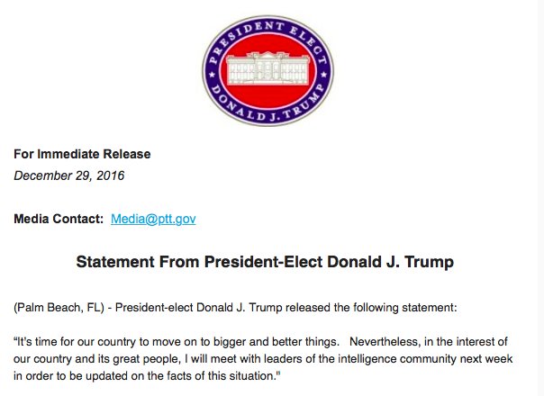 Volgens de Amerikaanse inlichtingendiensten hebben de Russen invloed proberen uit te oefenen op de verkiezingen, vervolgens roept de Senaat het Witte Huis op de tot actie.quote:Op vrijdag 30 december 2016 09:34 schreef Perrin het volgende: