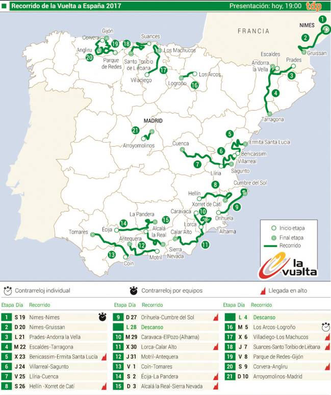 Tussendoor lijken er zowaar zelfs wat heuvelritten te zitten. De rit naar Andorra bijvoorbeeld. Paar beklimmingen daar, maar dan een aankomst ergens beneden. De finish in Cuenca zou dezelfde zijn als in 2006, toen Sammy Sanchez daar won. Nog een klimmetje daar, afdalinkje. Iets voor de goede dalers van deze wereld.