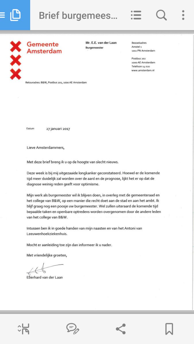 Van der Laan heeft dit laten weten in een brief. In de brief laat de burgemeester doorschemeren dat de perspectieven voor genezing niet goed zijn.