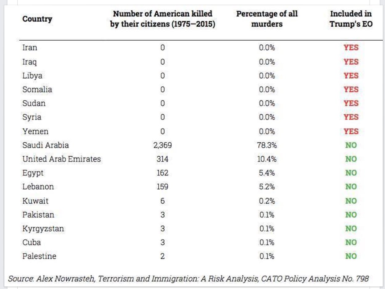 • Of all the fatal terror attacks carried out on US soil since 9/11, exactly zero have been committed by immigrants from the seven majority Muslim countries targeted by the ban