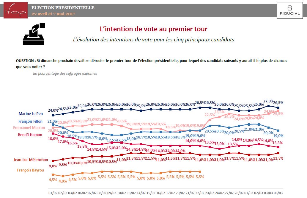 | De aandacht zou nu de Nederlandse naar de Franse verkiezingen gaan. Morgen eerste debat. 5 kandidaten doen mee: Le Pen, Macron, Fillon, Hamon en Melenchon. Er worden in deze campagne 3 debatten gehouden wat een unicum is, omdat er nooit debatten zijn geweest voor de eerste ronde Ifop peiling Le Pen 26.5% Macron 26% Fillon 18% Hamon 13.5% Melenchon 10.5% Macron 61% Le Pen 39% Fillon 56% Le Pen 44% | |