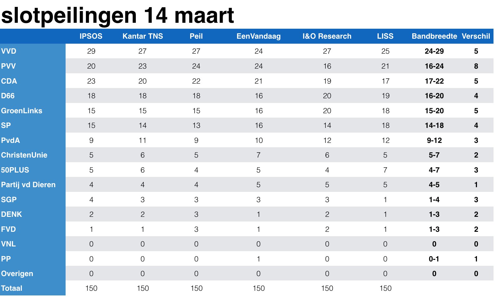De slotpeiling van LISS is in elk geval ongeloofwaardig imo. Waarom? Omdat het voorspelt dat SGP van 3 naar 1 zetel gaat. Dat is ongeloofwaardig omdat een zwaar gereformeerde harde kern nooit iets anders gaat stemmen dus die variatie kan nooit een factor 3 zijn. Je moet rekening houden met afrondingsfouten maar zelfs tussen 2.5 en 1.4 zetels zit een factor 1.8.quote:Op dinsdag 14 maart 2017 20:01 schreef SureD1 het volgende: