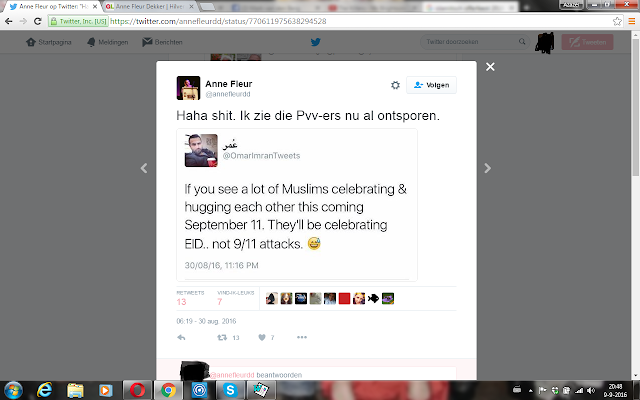http://jalta.nl/politiek/(...)-tweet-was-onhandig/quote:De tweet van Anne Fleur Dekker was erg onhandig, doch uit context gerukt. Ze mag zeggen wat ze wil. Het is heel erg dat ze is bedreigd.