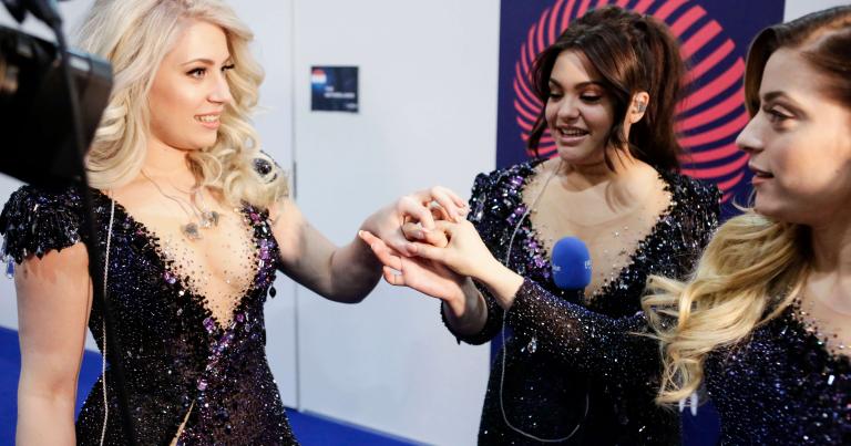 If you’re a fan of Lindita’s music video for “World”, then you’re going to be a huge fan of her staging at Eurovision 2017. During her first rehearsal she took visual elements of her music video and made them bigger and more arresting. The performance opens with her singing before mountains and bathed in dark green light. The clock from her video appears on the LED walls and fills the entire circular stage floor, ticking to the beat. Her armada of spaceships sails past, eventually interweaving with the clocks on the screens. The visuals don’t particularly tell a story — the ships remind us of the ones in the Of Monsters and Men video “Little Talks”. But following the somewhat predictable performance from Tamara, this blast of WTF really stands out. Vocally Lindita was as sound as ever. That, combined with her memorable LED, has elevated her to