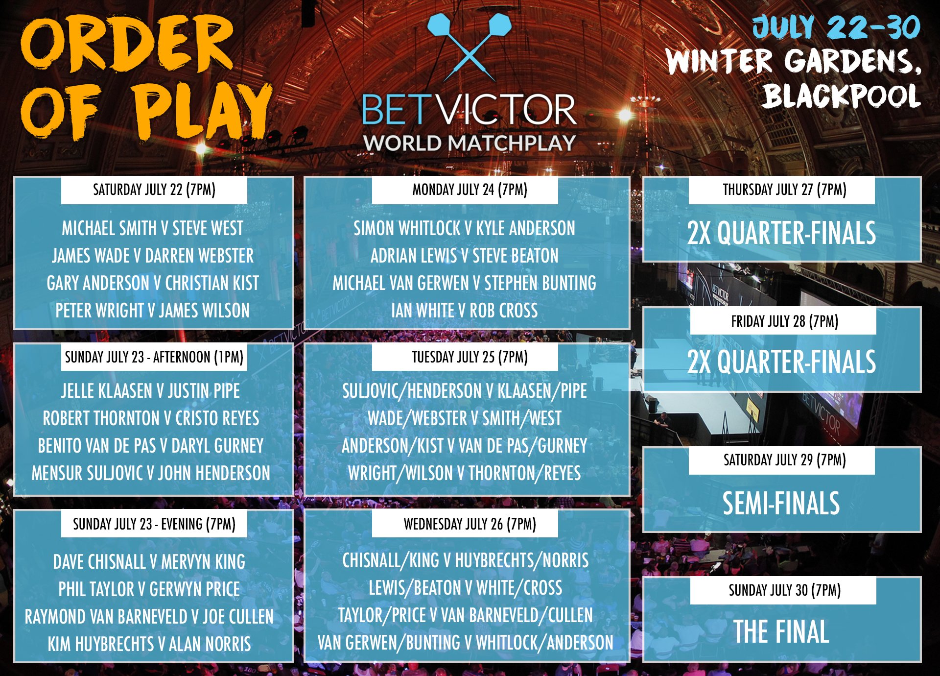 ![]() Vanaf zaterdag 22 juli is het weer negen dagen lang darten op de televisie. De World Matchplay is aan de beurt. Dit toernooi wordt jaarlijks georganiseerd in de Winter Gardens van Blackpool. Voor een gemiddelde volger iets waarnaar weer even werd uitgekeken, voor de hardcorevolger het zoveelste toernooi maar dat doet er niet toe. Darten is een religie met drie pijltjes en een rond bord. Vanzelfsprekend is de grootste kanshebber Michael van Gerwen. Hij heeft dit toernooi al twee jaar op rij gewonnen, maar heerst op elk tv-toernooi dat er is. Voor de duidelijkheid; de afgelopen World Series werden glansrijk door hem gewonnen. Dave Chisnall werd in Shanghai met 8-0 van het bord gepoetst en in Las Vegas moest Gurney het afleggen in de finale. De laatste tegenvaller dateert van een Euro Tour begin deze maand. Daar legde hij het in de achtste finales met liefst 2-6 af tegen de revelatie Rob Cross. Gelukkig is het brommertje gewoon weer on fire. Als we verder kijken naar het deelnemersveld, valt op dat we vijf Nederlanders hebben. Van Gerwen opent tegen Stephen Bunting, Van Barneveld treft Joe Cullen, Klaasen treft Justin Pipe, Benito van de Pas treft Daryl Gurney en Christian Kist moet tegen Gary Anderson spelen. Alleen Klaasen en Van Gerwen lijken 'makkelijke' lotingen te hebben. De andere Nederlanders krijgen het wat lastiger. Ik ben geen nationalist, misschien u wel. Vandaar deze alinea. Normaal gesproken is dit de laatste World Matchplay van Phil Taylor. Tot 2014 kwam hij hier zo graag. In elk interview bazuinde hij rond dat hij het zo geweldig vond. Niet heel gek, vaak wint gewoon de beste van de wereld dit toernooi en dat is toch echt Phil Taylor. Deze man gaat afbouwen, ermee stoppen, kappen, we zien hem binnenkort alleen nog terug op de invitatietoernooien. Voor het echie haakt Phil Douglas af. In 2014 won hij voor het laatst door Van Gerwen met 18-9 in zijn hemd te zetten. Taylor trapt zijn laatste World Matchplay af tegen Gerwyn Price. In de tweede ronde treft hij mogelijk Raymond van Barneveld. De meest interessante wedstrijd deze eerste ronde is voor mij Chisnall v King. Mervyn is de laatste weken in een heel goede vorm. Over formats richting de 16 legs moet hij het vaak afleggen, maar dit format is kort genoeg om Chisnall bij te kunnen houden. Van Chisnall weten we dat hij als het ware een magneetje bij de triples heeft, maar op de dubbels wil het nog wel eens een choke-fest zijn. Daar liggen kansen. Het bracket 1. Van Gerwen v Bunting 16. Whitlock v K. Anderson 8. Taylor v Price 9. Van Barneveld v Cullen 4. Lewis v Beaton 13. White v Cross 5. Chisnall v King 12. Huybrechts v Norris 2. G. Anderson v Kist 15. Van de Pas v Gurney 7. Suljovic v Henderson 10. Klaasen v Pipe 3. Wright v Wilson 14. Thornton v Reyes 6. Wade v D. Webster 11. Smith v West ![]() Format First Round - Best of 19 legs Second Round - Best of 21 legs Quarter-Finals - Best of 31 legs Semi-Finals - Best of 33 legs Final - Best of 35 legs Each game must be won by two clear legs, with up to a maximum of five additional legs being played before the sixth additional leg is sudden-death. For example, should a First Round game (best of 19 legs) reach 12-12, then the 25th leg would be the final and deciding leg. Prize fund Winner £115,000 Final £55,000 Semi Final £30,000 Quarter Final £17,500 Last 16 £11,000 Last 32 £7,000 Uitzendingen Zondagavond 23 juli pas om 22:30 vanwege Tour du Jour. | |