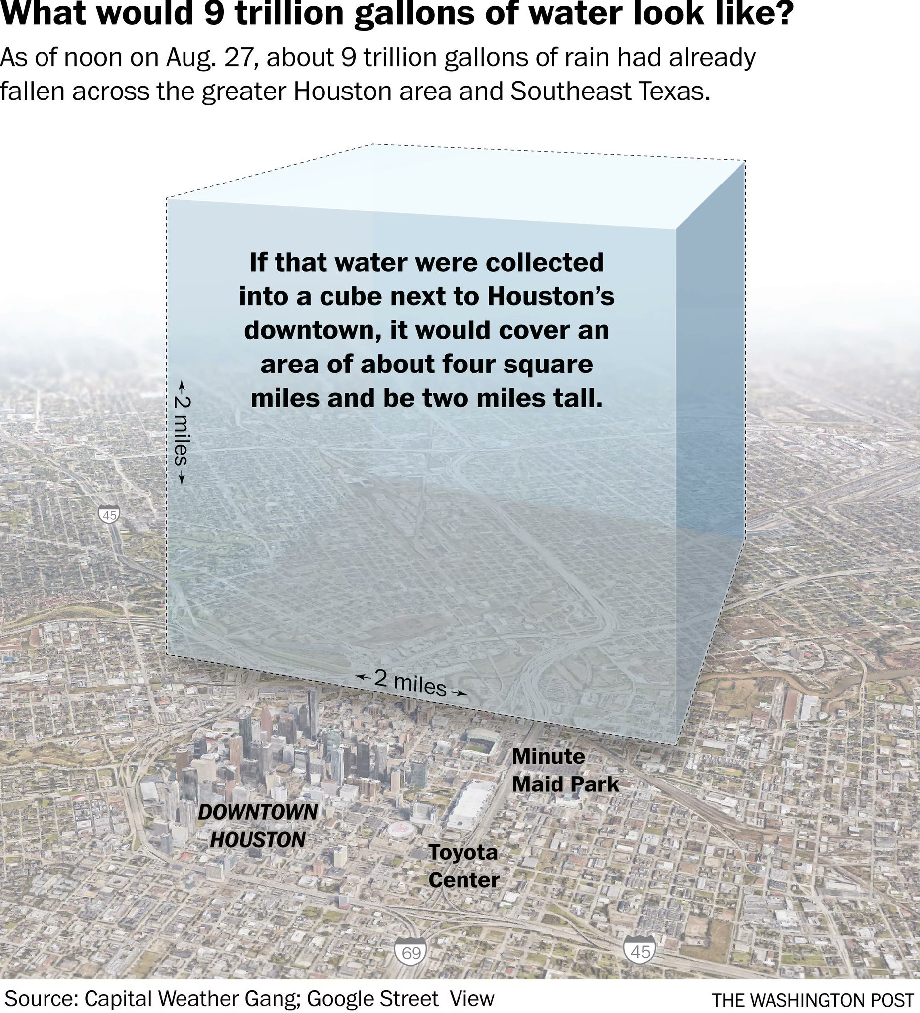 The answer to this is fascinating. Normally a hurricane pulls moisture up from the ocean and releases it as rain all around the storm’s area, particularly in the northeastern quadrant. But Harvey has dropped so much water over such a large area of southeastern Texas that the storm is pulling that water back up into itself and dumping it again as more rain. The flood area is so far and wide that it is acting like part of an ocean, feeding warm moisture up into Harvey. “You only need about 50 percent of the land to be covered with water for that to happen,” Masters says. “Obviously we have more than that in Texas.”